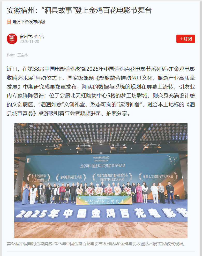 正在第38届中国片子金鸡暨2025年中国金鸡百花片子节系列勾当“金鸡片子珍藏艺术展”启动典礼上,国度级课题《影旅融合鞭策泗县文化、旅逛财产高质量成长》中期研究发布。