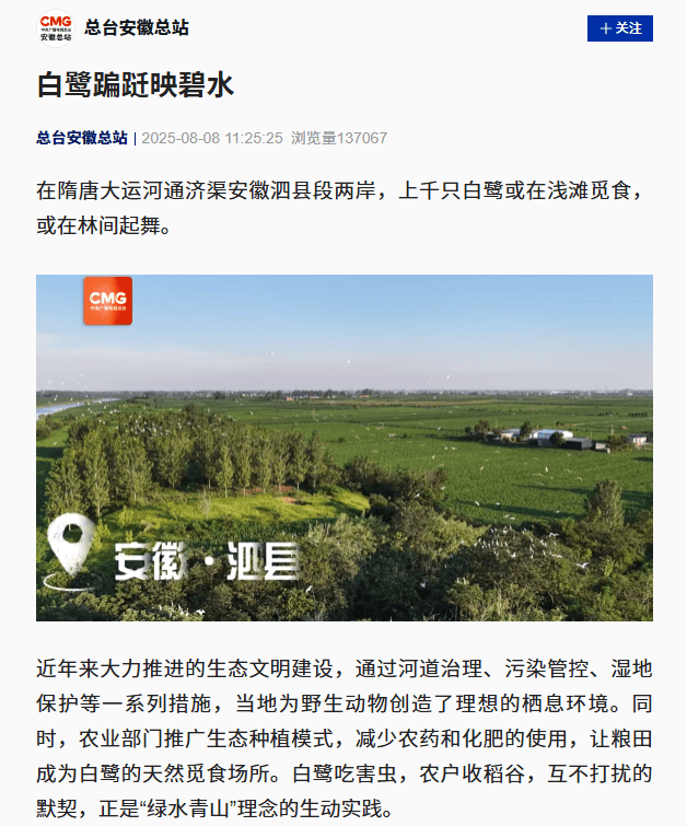 央视旧事报道,上千只白鹭翔集于隋唐大运河泗县段。这终身态美景,是本地推进河流管理、湿地取生态农业的,活泼注释了人取天然协调共生的绿色成长之。