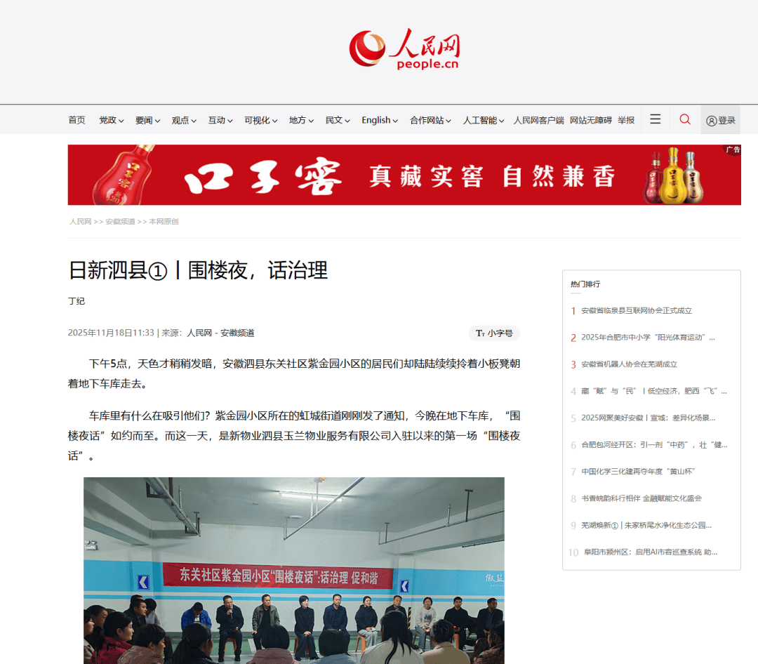 泗县“围楼夜话”立异社区管理,居平易近、街道取物业按期围坐议事,无效处理小区各类问题,入选安徽省下层管理典型案例。